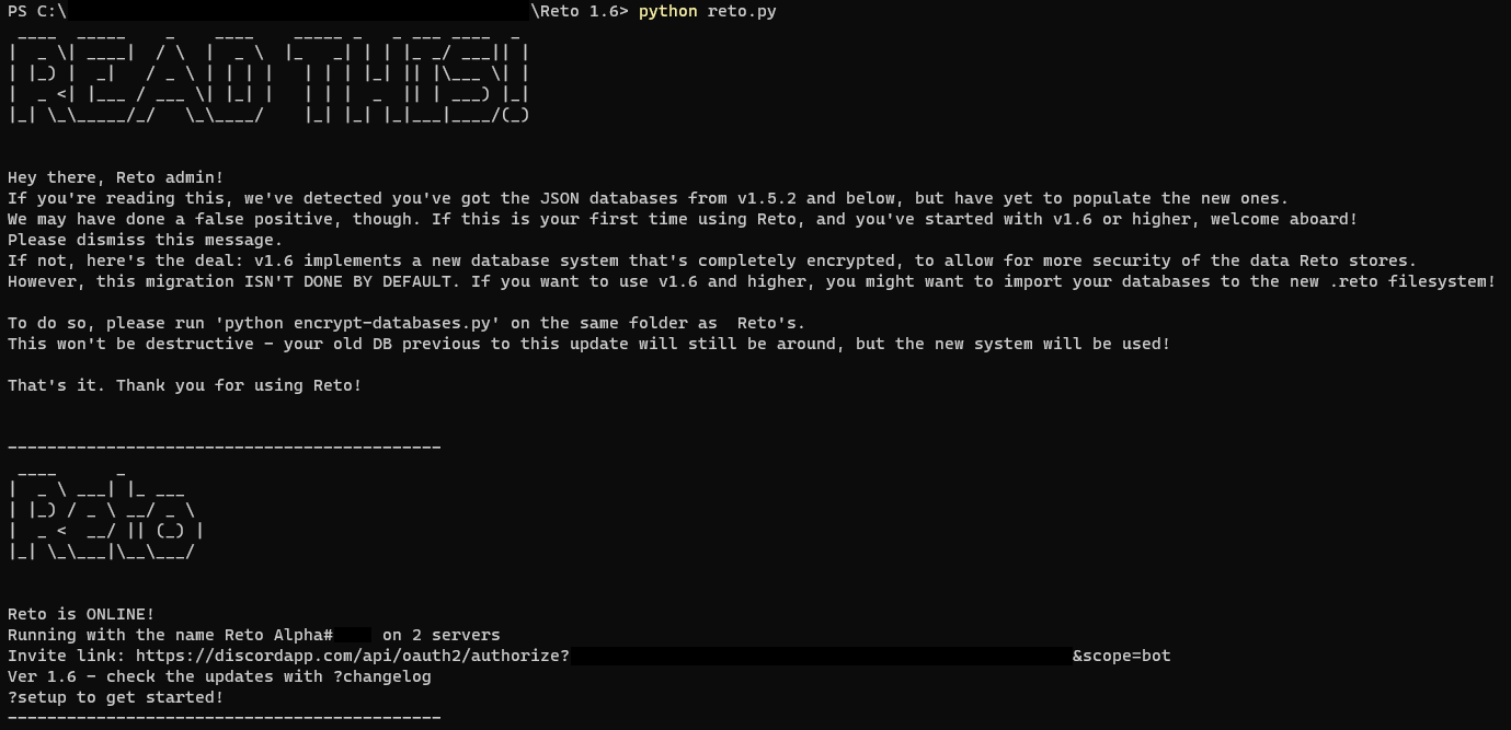 If you've just downloaded Reto from a version that's v1.6 or higher, this is most likely a false positive and you've nothing to worry about. If that's not the case, you might notice that all your databases have been reset - that's because on newer versions of the bot, an encrypted version of the original database is used that isn't compatible with the .JSON-based one from the get-go.
